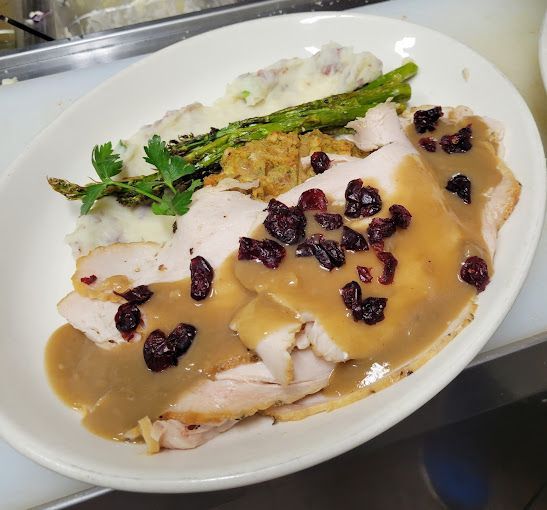 Tender turkey breast served on a stuffing waffle with hot gravy and choice of potato and vegetable.